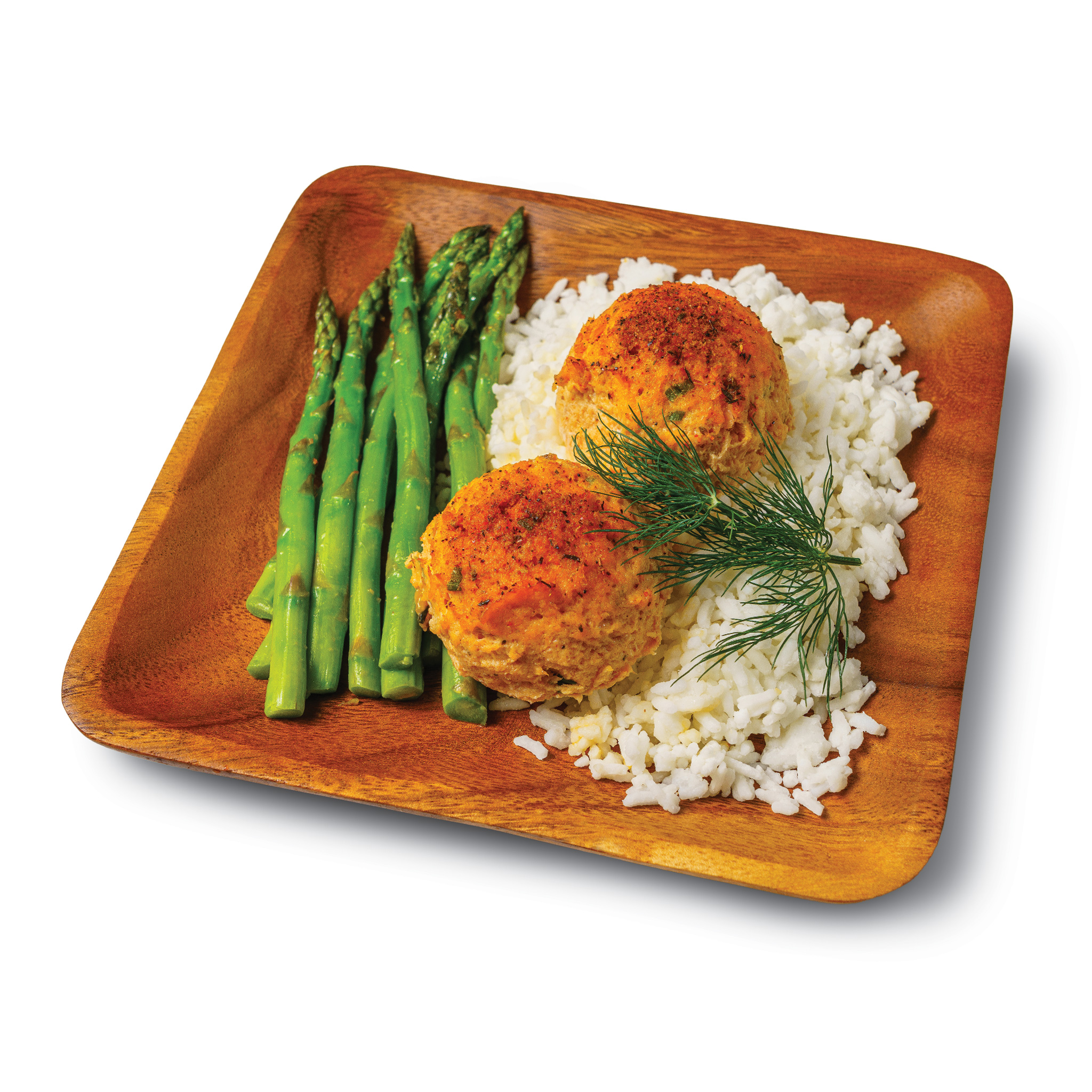 Indulge in the simple & exquisite flavors of our Wild Caught Salmon Sliders served with white rice & asparagus. The perfect lunch or dinner meal for those seeking a well-rounded meal with healthy fats, carbs & greens.